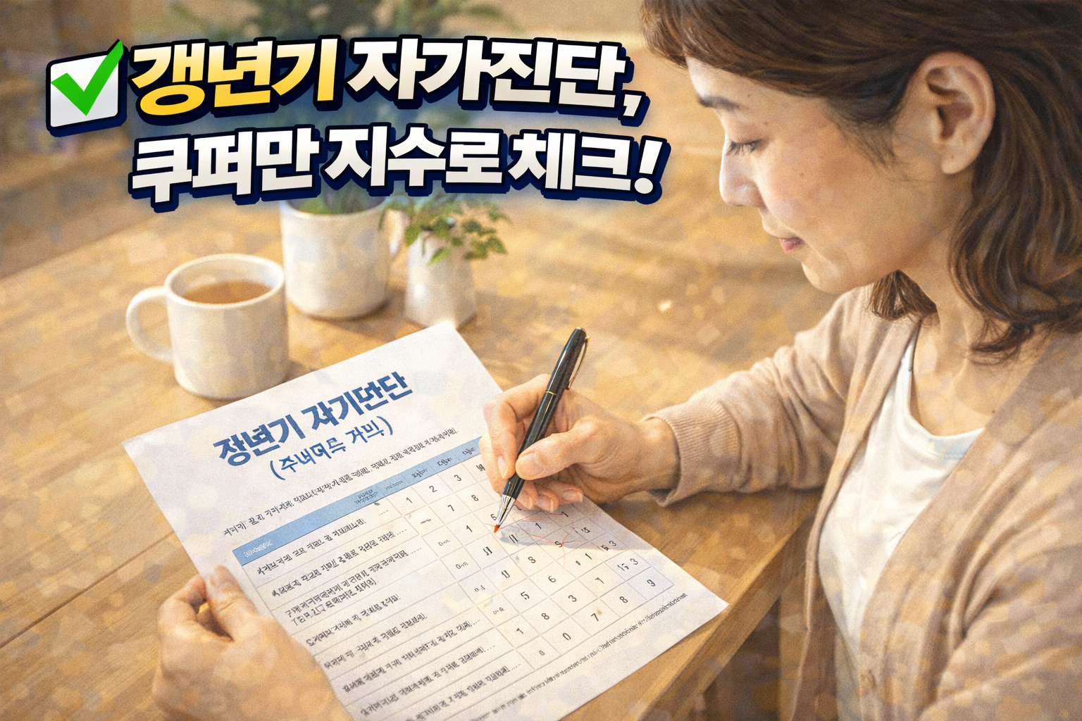 갱년기 증상이 의심되지만 병원 가기는 부담스럽다면? 쿠퍼만 지수 테스트로 집에서 5분만에 자가진단이 가능합니다. 전문의들이 인정한 검증된 방법으로 증상 정도를 객관적으로 파악하고, 맞춤형 관리법까지 확인해보세요.