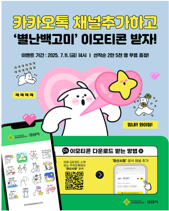경산시는 7월 11일부터 카카오톡 이모티콘 ‘별난 백고미’를 무료로 배포합니다. 총 16종으로 구성된 이 이모티콘은 경산시청 카카오톡 채널을 신규로 추가한 선착순 25,000명에게 제공되며, 다운로드 후 30일간 사용 가능합니다.