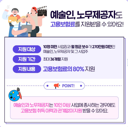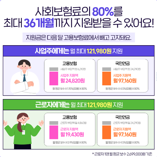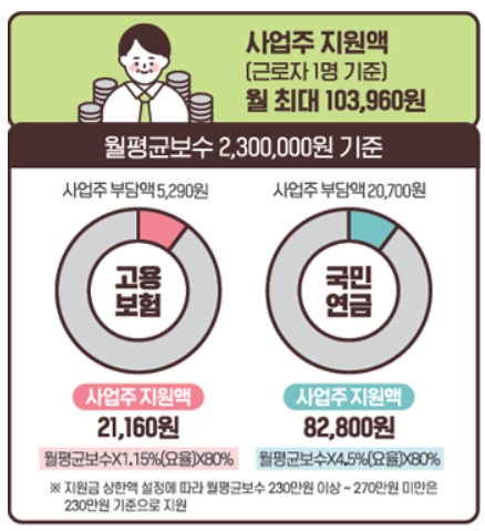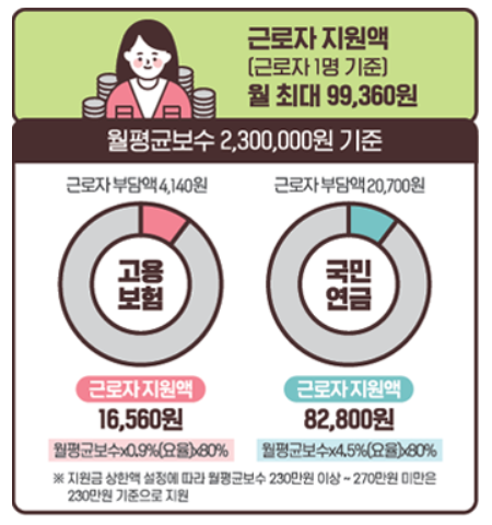 - 고용보험: 근로자 월 최대 16,560원, 사업주 최대 21,160원 지원