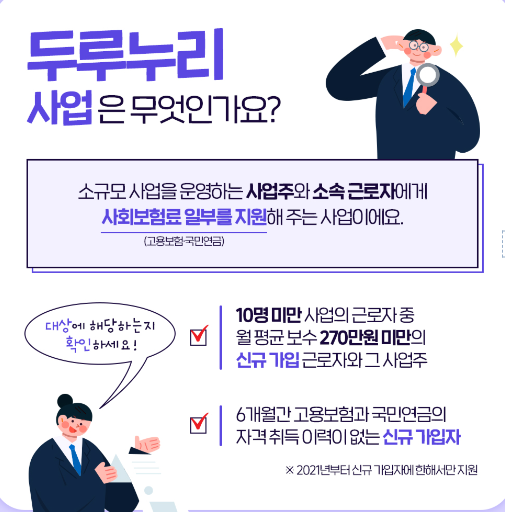 사회보험료가 부담스러워 망설였던 소규모 사업장이라면, 지금 바로 두루누리의 혜택을 누려보세요!