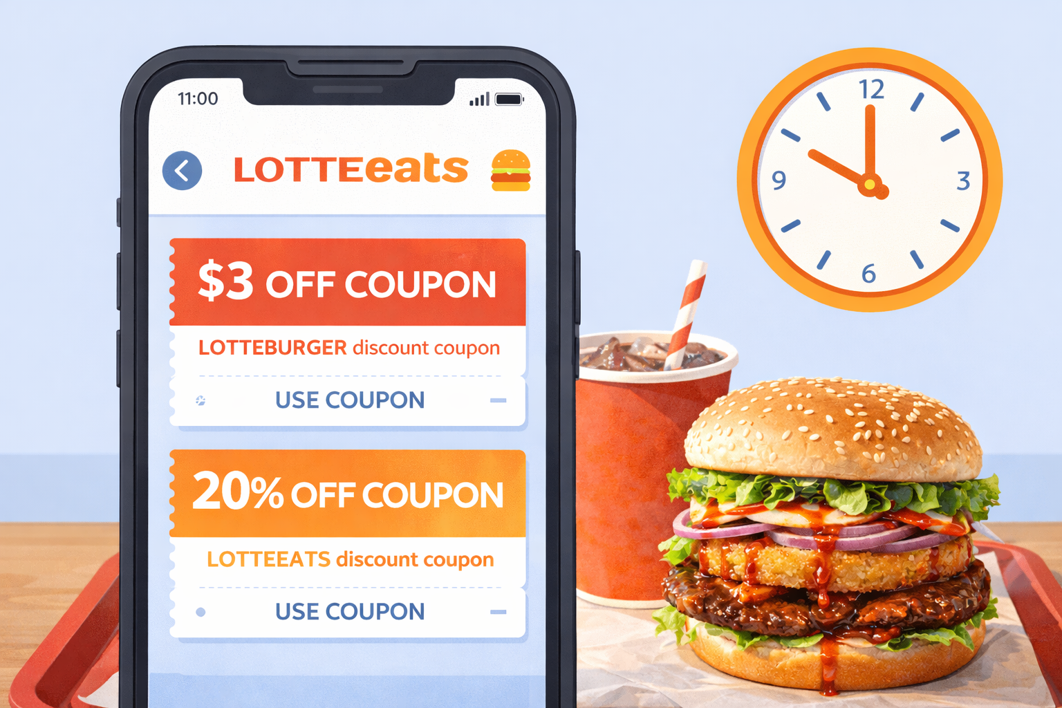 롯데잇츠 앱으로 주문하면 신규가입 20% 할인쿠폰과 매주 화요일 '버거데이' 30% 할인을 받을 수 있습니다. 적립금은 구매금액의 3%이며, 생일월에는 무료버거 쿠폰이 지급됩니다. 딜리버리 주문 시 3만원 이상이면 배달비 무료입니다.