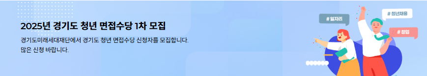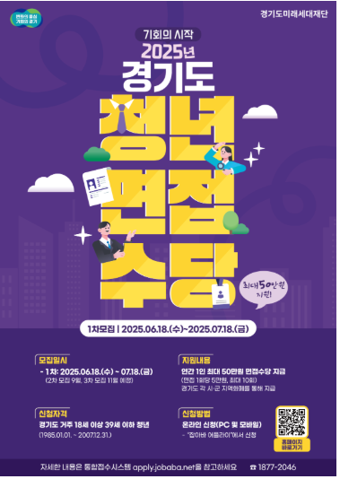 ‘경기도 청년면접수당’은 면접을 준비하고 있는 청년들의 비용 부담을 덜어주고, 보다 활발한 구직활동을 유도하기 위해 경기도에서 지원하는 제도입니다.