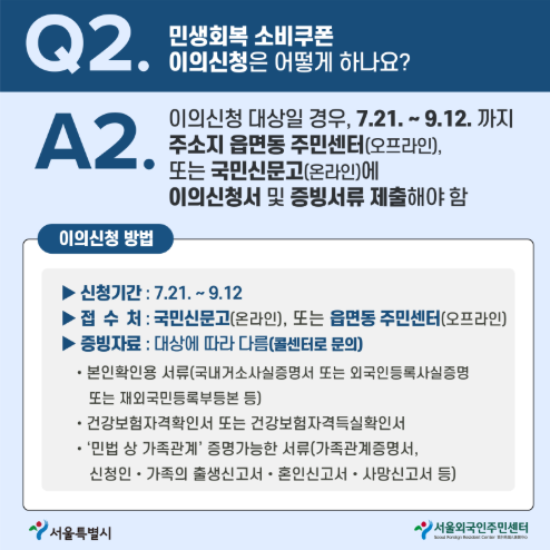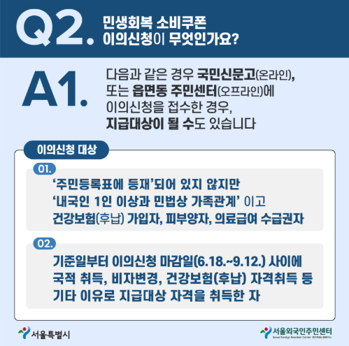 반드시 지정된 접수처를 이용해야 하며, 재외공관을 통한 신청은 불가합니다. 신청 관련 문의는 ‘민생회복 소비쿠폰 전담 콜센터(1670-2525)’ 또는 ‘국민콜110’에서 가능합니다.