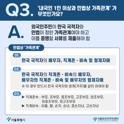 | 국내 체류 외국국적동포 | ① 영주권(F-5) + 건강보험/의료급여 수급 ② 영주권 없어도, 한국 국적자와 주민등록표 등재 + 건강보험/의료급여 수급 |
