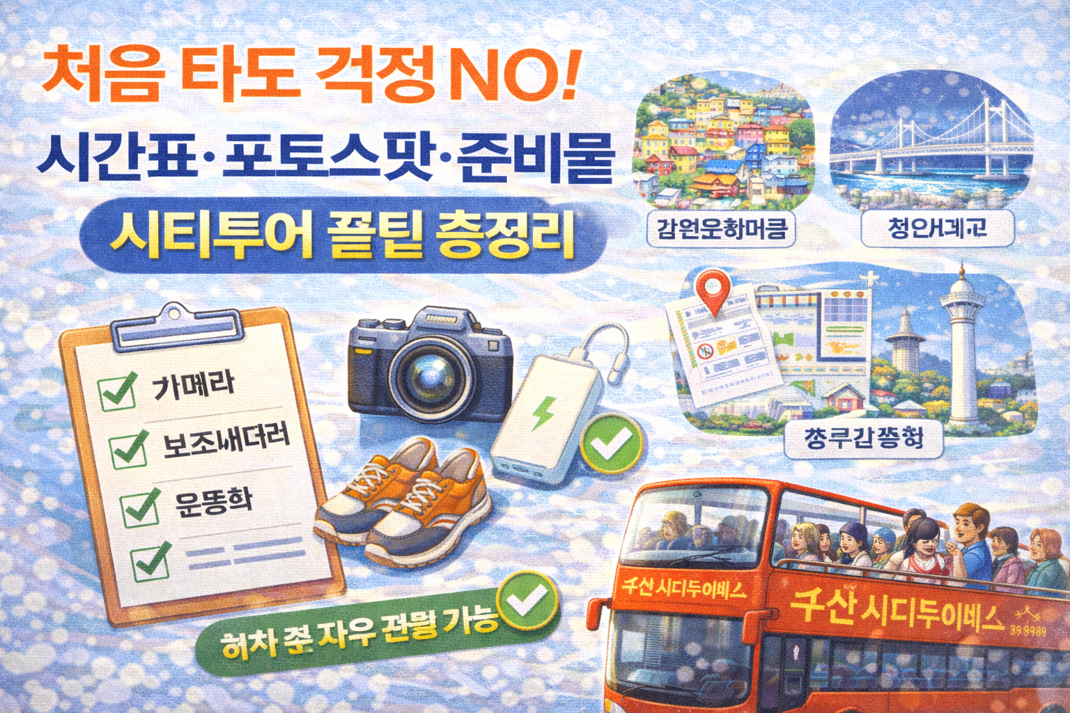 부산 시티투어버스 이용 시 준비하면 여행이 훨씬 편해지는 필수 아이템들을 정리했습니다. 특히 야외 관광이 많아 날씨 대비용품은 필수예요.