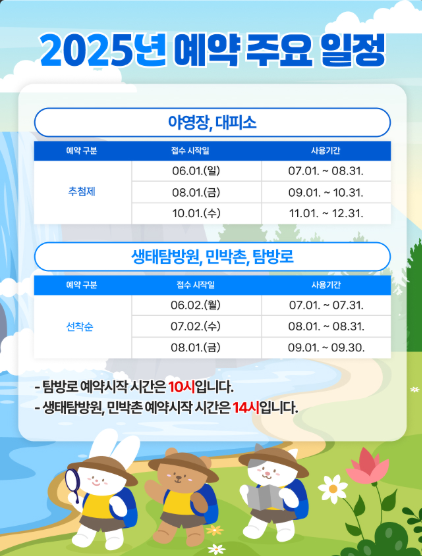 - 공공 캠핑장: 보통 3개월 전부터 예약이 오픈되는데, 매달 말일 자정이나 1일 오전에 접수가 시작되는 경우가 많으니 미리 체크 필수!