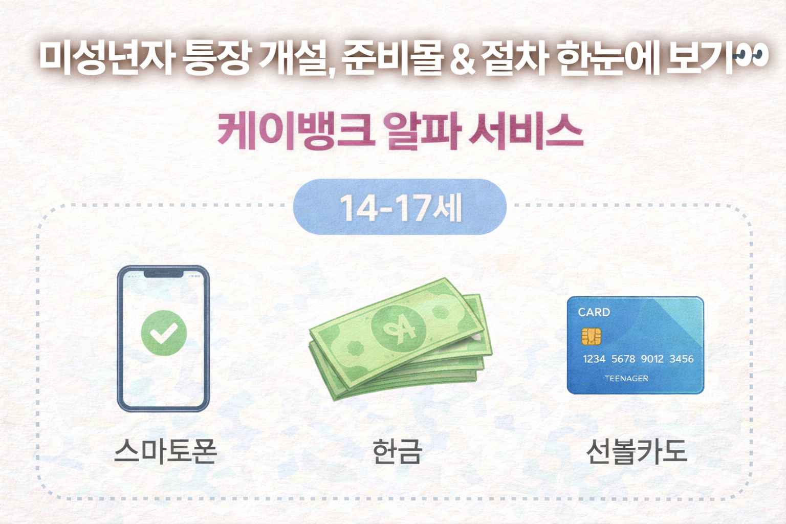 미성년자도 케이뱅크 통장 개설이 가능하다는 사실, 알고 계셨나요? 부모님 동의만 있으면 14세부터 본인 명의로 통장을 만들 수 있고, 알파 서비스까지 이용할 수 있습니다. 연령별 조건과 준비물만 정확히 알면 온라인으로 간편하게 신청할 수 있어요.