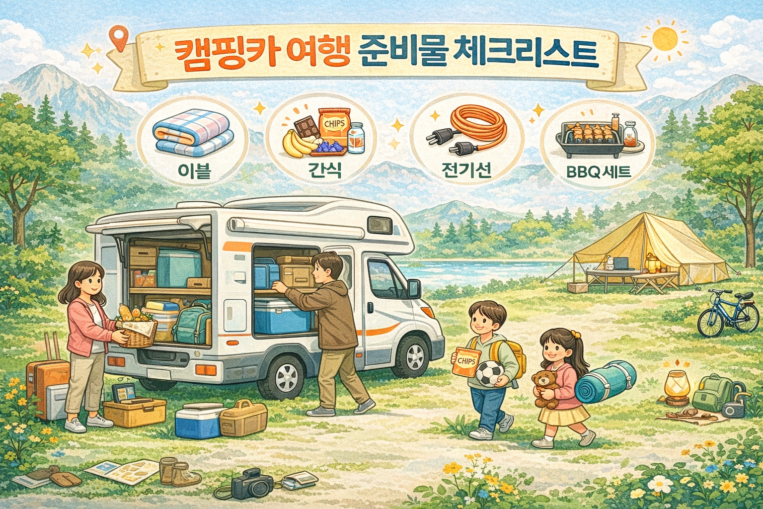 캠핑카에는 기본 침구와 조리도구가 제공되지만, 개인 위생용품과 식자재는 직접 준비해야 합니다. 전기 연결선(50m 이상), 상수도 호스, 하수 호스는 대부분 포함되어 있으나 예약 시 확인 필수입니다. 겨울철에는 동파 방지용 열선과 추가 난방기구, 여름철에는 선풍기와 모기장을 꼭 챙기세요. 캠핑장 전기 사용료는 보통 1박당 5,000~10,000원 추가되며, 개인 식기와 조미료는 100% 본인 부담입니다.