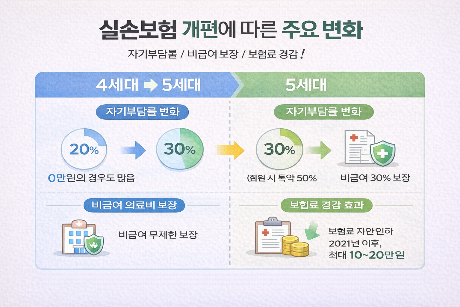 보험료는 오르는데 보장은 줄어든다? 2021년 7월 출시된 5세대 실손보험은 4세대 대비 보험료는 최대 30% 저렴하지만 보장 내용이 달라져 꼼꼼한 비교가 필수입니다. 지금 가입 중인 실손보험을 유지할지, 5세대로 갈아탈지 결정하는 핵심 정보를 모두 정리했습니다.