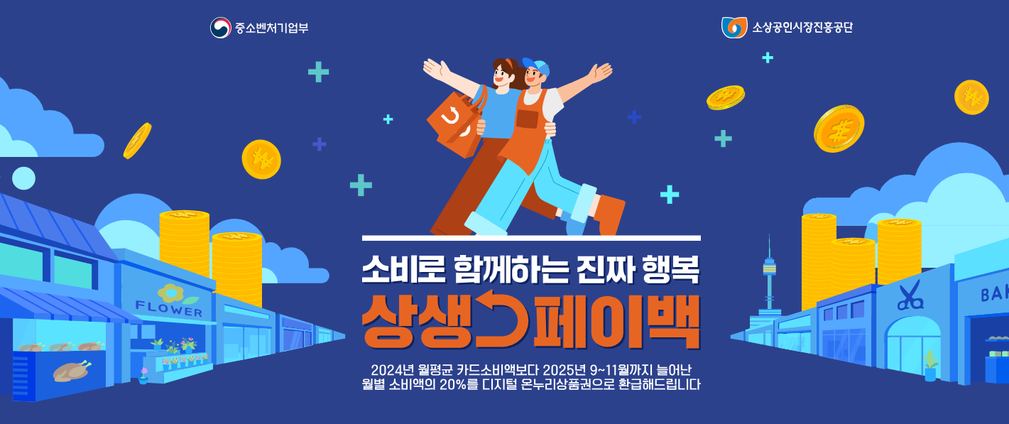 중소벤처기업부 주관, 총 예산 1조 3700억 원 규모로 진행되는 상생페이백 사업은 9월부터 11월까지 카드 사용 금액이 작년 동기간 대비 증가했을 경우, 증가액의 20%를 디지털 온누리상품권으로 환급해 주는 정책입니다. 최대 환급 한도는 3개월간 30만 원(월별 최대 10만 원)이며, 디지털 온누리상품권은 전국 약 13만 개의 전통시장, 동네마트, 음식점 등에서 현금처럼 사용할 수 있습니다.