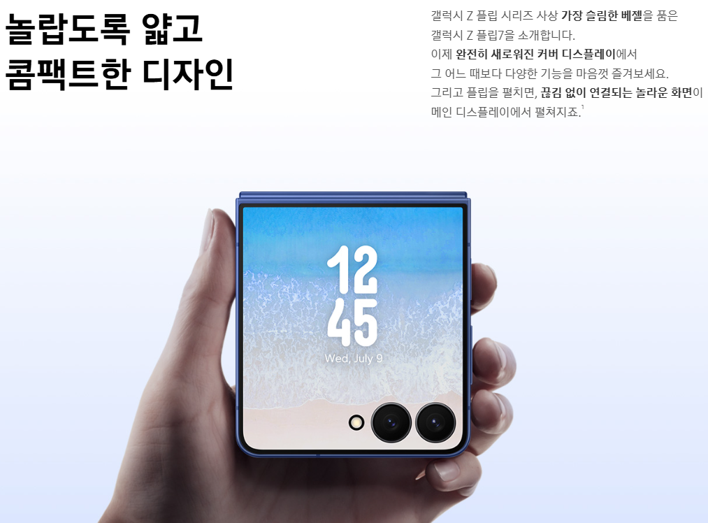 Z 플립 7은 커버 디스플레이 크기가 확대되고 베젤이 슬림해져 더욱 넓고 시원한 화면을 제공할 것으로 기대돼요. 커버 디스플레이 활용도가 높아질 뿐만 아니라, 메인 디스플레이 역시 가로로 길어져 몰입감을 높일 것 같아요.